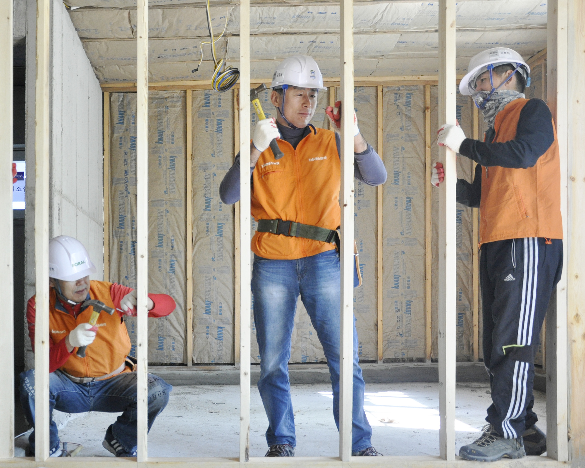 많지 않은 인원이지만 4개조(페인트칠, 내부 목조마감재 작업, 벽돌 바르기, 천장 골조 작업)로 나뉘어 활동을 하였습니다.