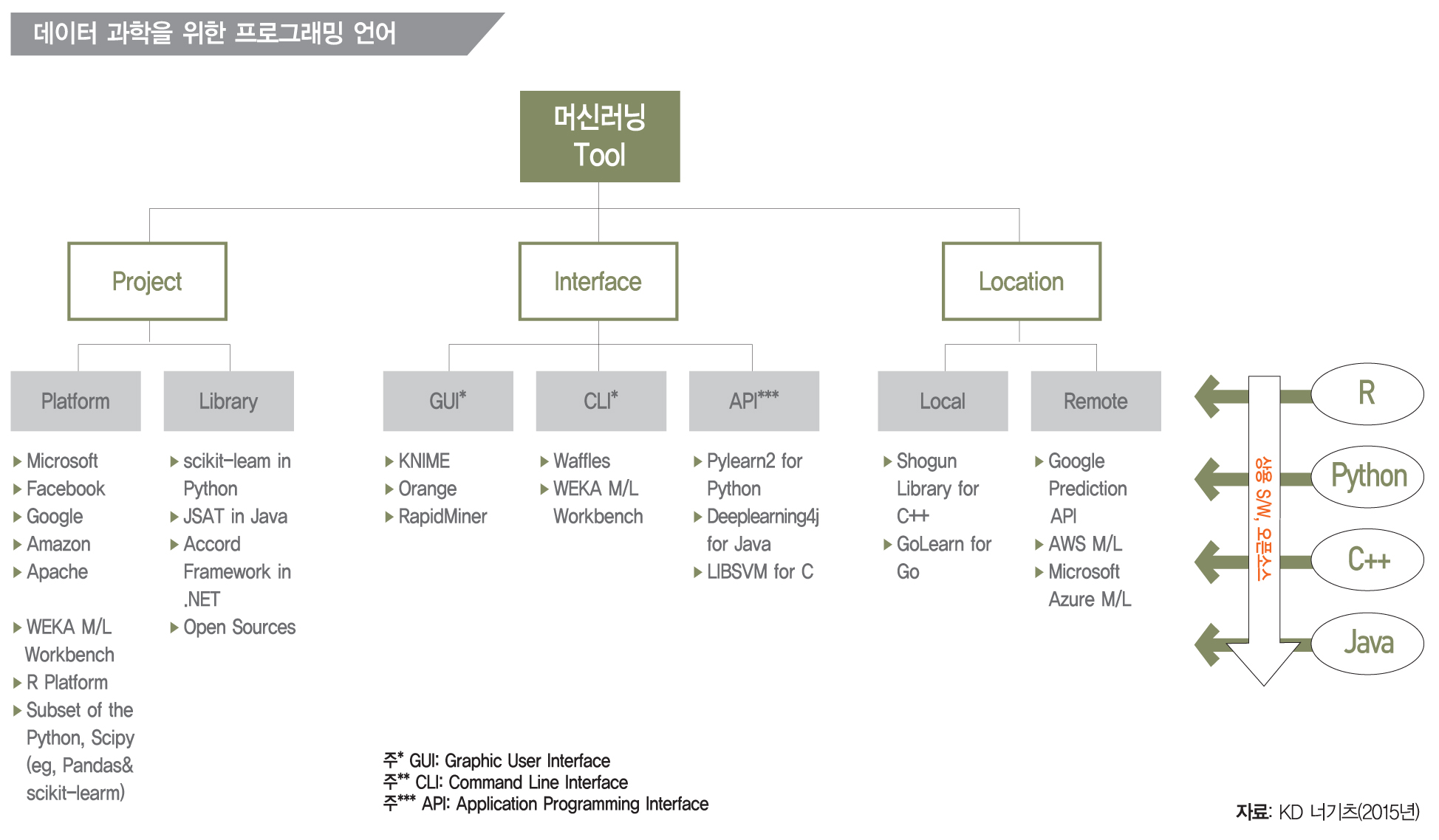 현재 머신러닝 기술은 대기업의 머신러닝 플랫폼과 상용SW 및 오픈소스 라이브러리 등이 공존하는 복잡한 생태계를 형성하고 있다. 미국에는 전국적인 데이터 과학data science 전문가들이 공개적으로 참여하는 프로젝트 플랫폼인 캐글Kaggle이 있다. 상용 소프트웨어와 오픈소스(MIT, 버클리 캘리포니아대, 뉴욕대 등)에서 만든 라이브러리와 상용 소프트웨어는 상호 협업하면서 개발자들의 필요와 산업별 특성에 따라 다양한 선택이 가능하다. 현재 대표적인 상용 플랫폼과 머신러닝 전문가들이 주로 사용하는 라이브러리, 인터페이스 방식, 위치 등에 따라서 정리해볼 수 있다.