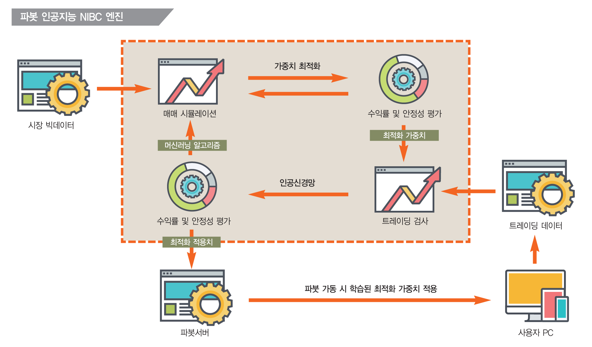 전문가 시스템이 완성됐다면 둘째 단계인 머신러닝 단계로 넘어갈 수 있다. 전문가 시스템은 전문가인 사람의 경험을 통해 만들어졌기 때문에 많은 상황을 고려하긴 했지만 한계가 있다. 따라서 전문가 시스템을 중심에 두고 머신이 스스로 학습을 통해 더욱 발전시켜 나가는 단계가 필요하다. 이것을 실현하기 위해 머신러닝이 필요하다. 알파고가 전문 프로 바둑기사들을 통해 일정한 기보를 익히고 그 기보를 중심으로 스스로 학습하면서 보다 좋은 수를 착수할 수 있었듯이 파봇도 투자 전문가를 통해 배운 투자 방법을 중심으로 좀 더 좋은 투자 결과를 얻기 위해 스스로 값들을 조절하면서 상황에 대처해 나간다.