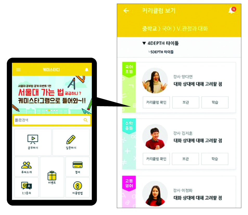 플랫폼 전문 기업인 에이스탁이 지난 3월 1일 내놓은 ‘신상’이다. 최근 구글스토어 교육 카테고리 신규 인기 앱 부문에서 최단 기간 1위에 등극하기도 했다. ‘케미스터디’는 서울대 재학생들이 진행하는 과외 앱이다. 기존 동영상 강의는 교과서나 문제집, 해설서 등의 단원별 학습이 이뤄지지만, ‘케미스터디’는 학습자가 모르는 개념이나 문제만 검색해 찾아볼 수 있다. 예를 들어 ‘연립방정식의 미지수를 소거하는 방법’이나 ‘to 부정사로 활용할 수 없는 동사들’처럼 특정 개념이나 원리만 골라 학습하는 것이다.
