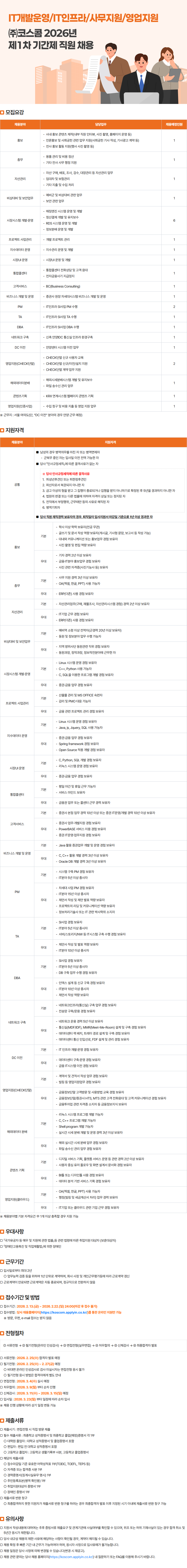 IT개발운영/IT인프리/사무지원/영업지원 (주)코스콤 2026년 제1차기간제 직원 채용 ▣ 모집요강 채용분야 담당업무 채용예정인원 사내홍보콘텐츠제작(내부 직원인터뷰,사진촬영,홈페이지운영등) 홍보 언론홍보및사회공간관련업무지원사회공한기사작성,자사광고기약품) 전사 홍보활동지원(행사사진촬영등) 용품관리및비용정산 총무 1 기타전사무행정 지원 자산구매, 배포, 조사, 검수, 대장관리등자산관리 업무 자산관리 임대차및보험관리 기타지출및수입처리 예비군및비상대비관련업무 비상대비및 보안업무 -보안관련업무 매칭엔진시스템운영및개발 청산결제개발및유지보수 시장시스템 개발·운영 RDS시스템운영및개발 정보분배운영및개발 프로젝트사업관리 개발프로젝트관리 지수데이터운영 지수관리운영및개발 1 시장UI운영 시장U운영및 개발 통합콜센터: 전화상담및고객응대 통합콜센터 - 전자금융사기 지급정지 고객서비스 BC(Business Consulting) 1 비즈니스개발및운영 증권사 원장차세대시스템비즈니스개발및운영 1 PM IT인프라SI사업PM수행 2 TA IT인프라SI사업 TA수행 1 DBA IT인프라 SI사업DBA수행 네트워크구축 신축 안양IDC 통신실 인프라 환경구축 DC이전 안양센터시스템이전업무 CHECK단말 신규사용자 교육 영업지원(CH ECK단말) CH HECK단말신규/이전/설치지원 Cl HECK단말계약업무 지원 해외시세분배시스템 개발및유지보수 해외데이터분배 파일송수신관리업무 콘텐츠기획 KRX연계시스템웹페이지콘텐츠기획 영업지원(인증사업) 수입청구및비용지출등영업지원업무 ※근무지 : 서울여의도(단, "DC이전"분야의 경우안양근무예정) . 지원자격 채용분야 지원자격 ■ 남성의 경우 병역의무를 마친 자 또는 병역면제자 군복무중인자는 입사일이전전역 가능한 자 ■ 당사 「인사규정세칙」에 따른결격사유가없는자 ※ 당사인사규정세칙에따른결격사유 1. 피성년후견인또는피한정후견인 공통 2. 파산자로서 복권되지아니한자 3. 금고이상의 형을 받고그집행이 종료되거나 집행을받지아니하기로확정된후! 5년을 경과하지 아니한 자 4. 법원의판결또는다른법률에의하여 자격이 상실또는정지된자 5. 전직에서부정행위, 근무태만 등의사유로해직된자 6. 병역기피자 당시정전자극중력보급기본인부담증,최종일대법시대담당시 의료프로기관에서명의본인부전자 학사 이상 학력 보유자(전공 무관) 글쓰기및문세작성역량보유재거시글,기시청문장,보고서 등작성 가능) 기본 대내외커뮤니케이션또는 홍보업무경험보유자 사진촬영및편집역량! 보유자[c] 홍보 기자경력2년이상 보유자 우대 금융·IT분야 홍보업무 경험 보유자 사진 관련 자격증(사진기능사를 등)보유자 사무지원경력3년이상보유자 기본 OA(엑셀, 한글, PPT) 사용 가능자 총무 우대 ERP(더존) 사용 경험보유자 기본 자산관리업무(구매 재물조사, 자신관리시스템 경험) 경력2년 이상! 보유자 자산관리 IT기업근무경험보유자 우대 ERP(더존) 사용 경험 보유자 예비역 : 소령이상전역자(군경력: 20년 이상 보유자) 기본 동원 및 정보분야 업무 수행 가능자 비상대비및보안업무 지역 방위사단 동원관련 직위 경험보유자 우대 동원 과장, 정작과장, 정보작전 분야에 근무한자 Linux 시스템 운영 경험 보유자 기본 C++, Python 사용가능자 시장시스템 개발·운영 C, SQL을 이용한 프로그램 개 발경험보유자 우대 증권·금융업무경험보유자 산출물관리및MSOFFICE숙련자 기본 감리및 PMO대응가능자 프로젝트사업관리 우대 금융 관련프로젝트관리 경험 보유자 - Linux시스템운영 경험보유자 기본 Java,js, Jquery, SQL 사용가능자 지수데이터운영 증권·금융업무 경험 보유자 우대 Spring framework 경험 보유자 OpenSource적용 개발 경험. 보유자 C,Python,SQL 개발경험보유자 기본 -리눅스시스템운영경험보유자 시장UI운영 우대 증권·금융업무 경험보유자 평일야간및휴일근무가능자 기본 서비스마인드보유자 통합콜센터 우대 금융권업무또는 콜센터근무 경력 보유자 기본 중심사본점입무영화10년이상또는중인7운임개발정력10년이상보유가 고객서비스 증권사 업무·개발지원 경험 보유자 우대 PowerBASE서비스이용 경험보유자 증권IT운영·업무지원 경험 보유자 기본 Java활용증권업무개발및운영경험보유자 비즈니스 : 개발및운영 C,C++활용개발경력3년이상 보유자 우대 OracleDB개발 경력3년이상 보유자 시스템구축PM경험! 보유자 기본 IT분야5년이상종사자 차세대 사업PM경험보유자 PM IT분야15년이상종사자 우대 제안서작성및 제안 발표 역량보유자 프로젝트의 리딩 및 커뮤니케이션 역량, 보유자 정보처리기술사또는IT관련 박사학위 소지자 SI사업경험보유자 기본 IT분야5년이상종사자 서버/스토리지/NW 등IT시스템구축 수행경험보유자 TA 제안사작성및발표역량, 보유자 우대 T분야 10년이상종사자 SI사업경험보유자 기본 -IT분야5년이상종사자 DB구축 업무 수행경험보유자 DBA 인덱스 설계등 신규구축경험보유자 우대 IT분야10년이상종사자 제안서 작성역량보유자 네트워크인프라(통신실) 구축 업무 경험! 보유자 기본 전송망구축/운용경험보유자 네트워크구축 네트워크운용경력5년이상보유자 통신실(MDF/IDF), MMR(Meet-l Me -Room)설계!