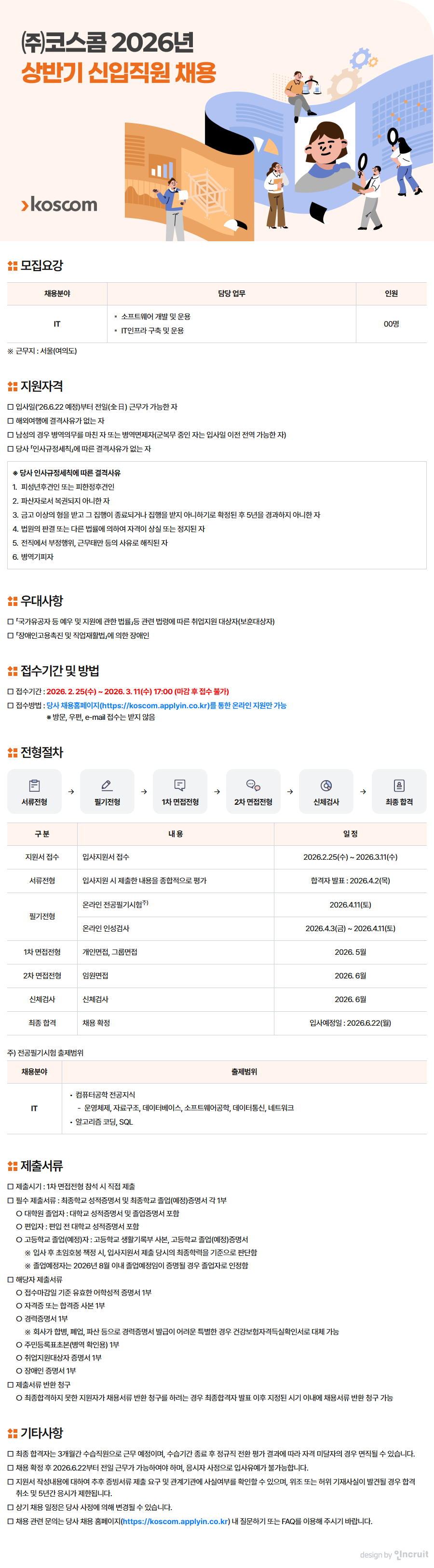 (주)코스콤 2026년 상반기 신입직원 채용 koscom 모집요강 채용분야 담당 업무 인원 ■ 소프트웨어 개발 및 운용 IT 00명 ■ IT인프라 구축 및 운용 ※ 근무지 : 서울(여의도) 지원자격 □ 입사일('26.6.22 예정)부터 전일(全日) 근무가 가능한 자 □ 해외여행에 결격사유가 없는 자 □ 남성의 경우 병역의무를 마친 자 또는 병역면제자(군복무 중인 자는 입사일 이전 전역 가능한 자) □ 당사 「인사규정세칙」에 따른 결격사유가 없는 자 ※ 당사 인사규정세칙에 따른 결격사유 1. 피성년후견인 또는 피한정후견인 2. 파산자로서 복권되지 아니한 자 3. 금고 이상의 형을 받고 그 집행이 종료되거나 집행을 받지 아니하기로 확정된 후 5년을 경과하지 아니한 자 4. 법원의 판결 또는 다른 법률에 의하여 자격이 상실 또는 정지된 자 5. 전직에서 부정행위, 근무태만 등의 사유로 해직된 자 6. 병역기피자 우대사항 □ 「국가유공자 등 예우 및 지원에 관한 법률」등 관련 법령에 따른 취업지원 대상자(보훈대상자) □ 「장애인고용촉진 및 직업재활법」에 의한 장애인 접수기간및 방법 □ 접수기간 : 2026. 2. 25(수) ~ 2026. 3. 11(수) 17:00 (마감 후접수 불가) □ 접수방법 : 당사 채용홈페이지(https://koscom.applyin.co.kr)를 통한 온라인 지원만 가능 ※ 방문, 우편, e-mail 접수는 받지 않음 11 전형절차 0 → 서류전형 필기전형 1차 면접전형 2차 면접전형 신체검사 최종합격 구분 내용 일정 지원서 접수 입사지원서 접수 2026.2.25(수) ~ 2026.3.11(수) 서류전형 입사지원 시 제출한 내용을 종합적으로 평가 합격자 발표 : 2026.4.2(목) 온라인 전공필기시험주) 2026.4.11(토) 필기전형 온라인 인성검사 2026.4.3(금) ~ 2026.4.11(토) 1차 면접전형 개인면접, 그룹면접 2026. 5월 2차 면접전형 임원면접 2026. 6월 신체검사 신체검사 2026. 6월 최종 합격 채용 확정 입사예정일 : 2026.6.22(월) 주) 전공필기시험 출제범위 채용분야 출제범위 · 컴퓨터공학 전공지식 IT - 운영체제, 자료구조, 데이터베이스, 소프트웨어공학, 데이터통신, 네트워크 · 알고리즘 코딩, SQL 제출서류 □ 제출시기: 1차 면접전형 참석 시 직접 제출 □ 필수 제출서류 : 최종학교 성적증명서 및 최종학교 졸업(예정)증명서 각 1부 ○ 대학원 졸업자: 대학교 성적증명서 및 졸업증명서 포함 O 편입자 : 편입 전 대학교 성적증명서 포함 O 고등학교 졸업(예정)자: 고등학교 생활기록부 사본, 고등학교 졸업(예정)증명서 ※ 입사 후 초임호봉 책정 시, 입사지원서 제출 당시의 최종학력을 기준으로 판단함 ※ 졸업예정자는 2026년 8월 이내 졸업예정임이 증명될 경우 졸업자로 인정함 □ 해당자 제출서류 o 접수마감일 기준 유효한 어학성적 증명서 1부 O 자격증 또는 합격증 사본 1부 ○ 경력증명서 1부 ※ 회사가 합병, 폐업, 파산 등으로 경력증명서 발급이 어려운 특별한 경우 건강보험자격득실확인서로 대체 가능 O 주민등록표초본(병역 확인용) 1부 O 취업지원대상자 증명서 1부 ○ 장애인 증명서 1부 □ 제출서류 반환 청구 O 최종합격하지 못한 지원자가 채용서류 반환 청구를 하려는 경우 최종합격자 발표 이후 지정된 시기 이내에 채용서류 반환 청구 가능 기타사항 □ 최종 합격자는 3개월간 수습직원으로 근무 예정이며, 수습기간 종료 후 정규직 전환 평가 결과에 따라 자격 미달자의 경우 면직될 수 있습니다. □ 채용 확정 후 2026.6.22부터 전일 근무가 가능하여야 하며, 응시자 사정으로 입사유예가 불가능합니다. □ 지원서 작성내용에 대하여 추후 증빙서류 제출 요구 및 관계기관에 사실여부를 확인할 수 있으며, 위조 또는 허위 기재사실이 발견될 경우 합격 취소 및 5년간 응시가 제한됩니다. □ 상기 채용 일정은 당사 사정에 의해 변경될 수 있습니다. □ 채용 관련 문의는 당사 채용 홈페이지(https://koscom.applyin.co.kr)내 질문하기 또는 FAQ를 이용해 주시기 바랍니다. design by 인ncruit