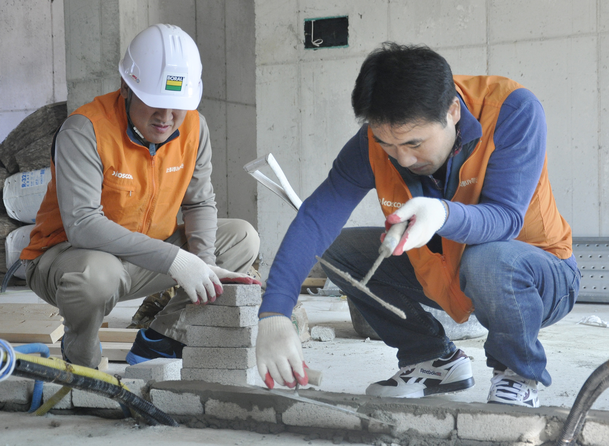 많지 않은 인원이지만 4개조(페인트칠, 내부 목조마감재 작업, 벽돌 바르기, 천장 골조 작업)로 나뉘어 활동을 하였습니다.