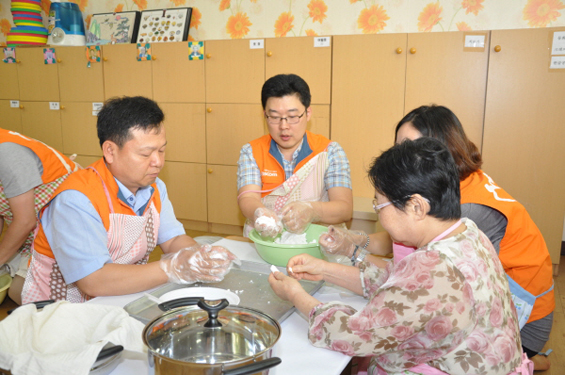 처음 빚어보는 송편이라 처음에는 어찌할 바를 모르던 임직원들은 어르신들께 배워 가면서 점차 손놀림이 익숙해졌습니다. 볼품없던 송편도 점차 예쁜 모양으로 발전해 갔고, 기계로 찍어낸 듯한(?) 모양을 만들 정도로 재능을 발휘한 임직원도 있었습니다. 잘 한다고 칭찬도 해 주시고 그렇게 하면 안된다고 가르쳐도 주시는어르신들 말씀과 함께 여기 저기서 웃음꽃이 피어났습니다.