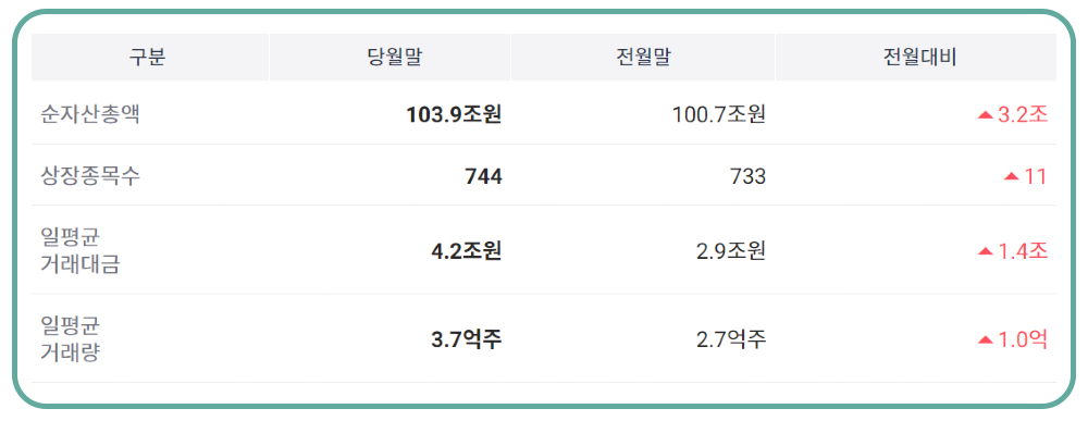 일평균 거래대금과 일평균 거래량도 전월 대비 모두 상승했다. ETF의 일평균 거래대금은 지난 7월 말 기준 4조 2,253억원으로, 전월(2조 8,537억원) 대비 1조 3,716억원 늘어났고, 일평균 거래량도 3억 6,904만주로, 전월(2억 6,890만주) 대비 1억 14만주 늘어났다.