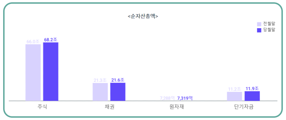상품별로는 순자산이 주식형 2조 2,205억원, 채권형 2,529억원, 단기자금형 7,158억원 증가했다.