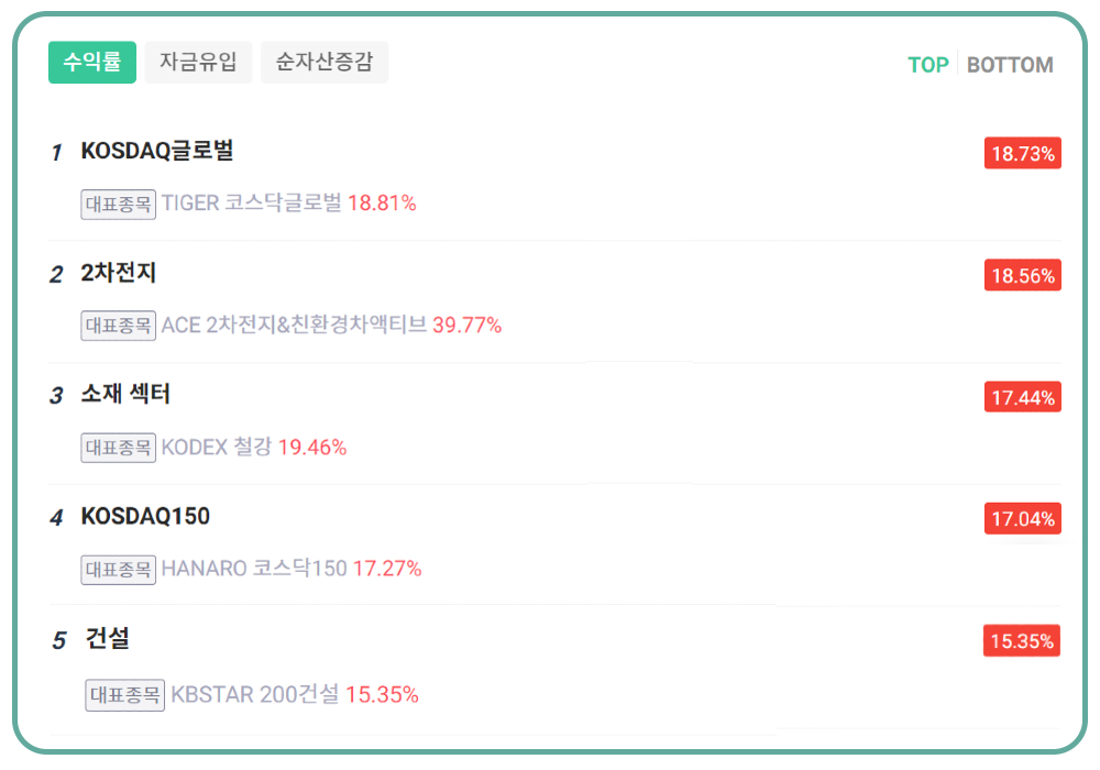 가장 높은 수익률을 기록한 ETF도 2차전지 테마 ETF였다. 미래에셋자산운용의 TIGER KRX2차전지K-뉴딜레버리지로 41.60%의 수익률을 올렸다. 한국투자신탁운용의 ACE 2차전지&친환경차액티브 ETF가 39.77%의 수익률을 내며 2위를 기록했다.