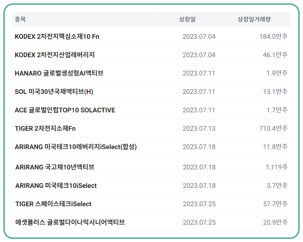 7월 신규 상장된 ETF는 총 11개로 한화자산운용에서 3개(ARIRANG 미국테크10배레버리지iSelect(합성), ARIRANG 국고채10년액티브, ARIRANG 미국테크10iSelect), 삼성자산운용에서 2개(KODEX 2차전지산업레버리지, KODEX 2차전지핵심소재10Fn), 미래에셋자산운용에서 2개(TIGER 2차전지소재Fn, TIGER 스페이스테크iSelect), 신한자산운용에서 1개[SOL 미국30년국채액티브(H)], 한국투자신탁운용에서 1개(ACE 글로벌인컴TOP10 SOLACTIVE), 에셋플러스자산운용에서 1개(에셋플러스 글로벌다이나믹시니어액티브)를 상장했다.