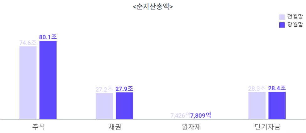 주식형 ETF의 순자산총액이 80조원을 돌파한 영향으로, 지난 3월 말 기준 주식형 ETF의 순자산총액은 80조731억원을 기록하며 전월(74조5647억원) 대비 5조5084억원 늘어났습니다. 채권형 ETF와 멀티에셋형 ETF도 소폭 증가하며 ETF 시장 순자산총액을 끌어올리는데 일조했습니다. 지난 3월 말 기준 채권형 ETF의 순자산총액은 27조9177억원으로, 전월(27조2047억원) 대비 7130억원 늘어났으며, 멀티에셋형 ETF의 순자산총액은 1조2191억원을 기록하며 전월(1조672억원) 대비 1519억원 증가했습니다.
