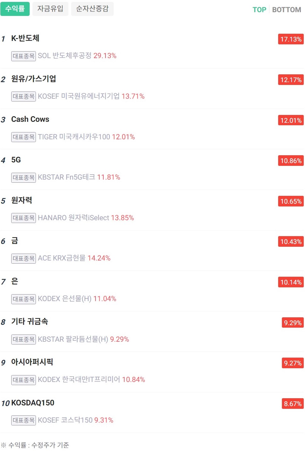 이어 원유/가스기업 테마 ETF의 한 달 평균 수익률은 12.17%로, 핫 테마 2위 자리에 올랐습니다. 이어 캐시카우 테마 ETF는 한 달 평균 수익률 12.01%, 5G 테마 ETF도 한 달 평균 수익률 10.86%의 수익률을 기록하며 각 3, 4위 자리를 차지했습니다.