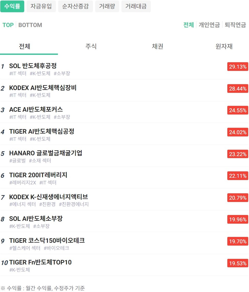 지난달 ETF 수익률 상위 역시 ‘반도체’가 휩쓸었습니다. 가장 높은 수익률을 올린 ETF는 신한자산운용의 SOL반도체후공정 ETF로 29.13%의 수익률을 올렸습니다. 이어 삼성자산운용의 KODEX AI반도체핵심장비가 28.44%, 한국투자신탁운용의 ACE AI반도체포커스가 24.55%, 미래에셋자산운용의 TIGER AI반도체핵심공정 ETF가 24.02%의 수익률을 기록하며 각 2,3,4위 자리를 차지했습니다.